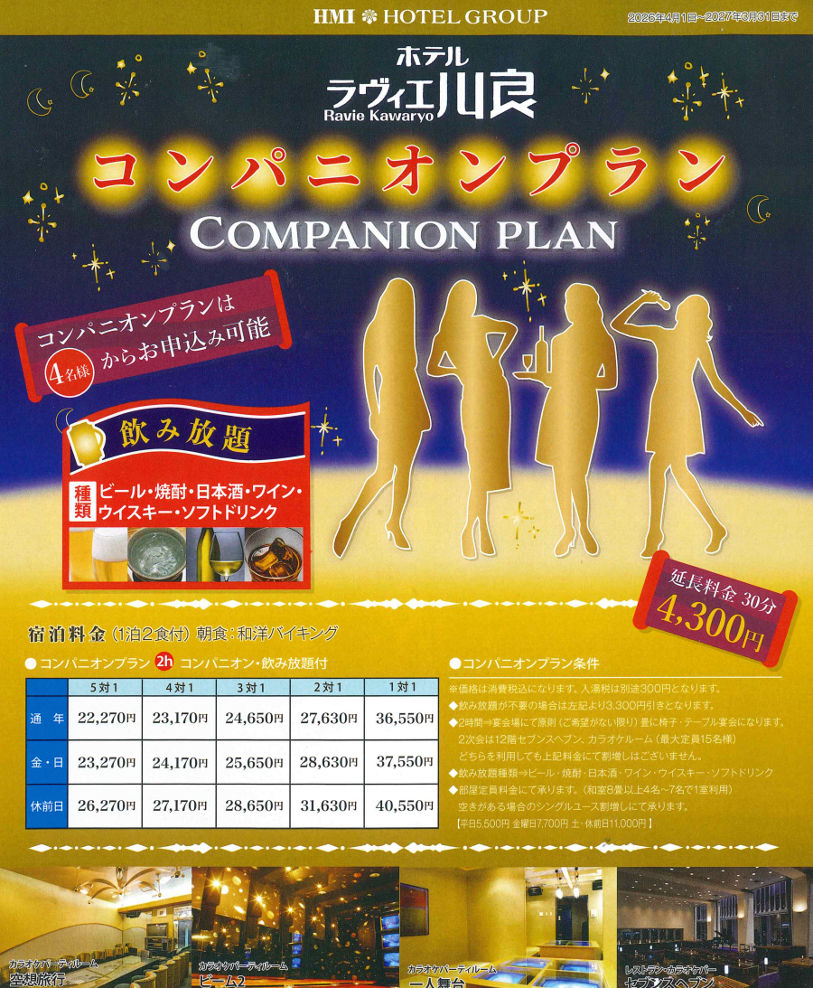 | 2名様:コンパニオン1人 | 27,930円 | 28,930円 | 31,930円 |