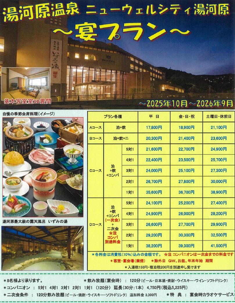 - 1泊2食+コンパニオン120分+飲み放題120分+二次会飲み放題120分
